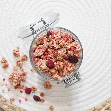 flocons de céréales* 47.6% ( AVOINE*, BLE*, SEIGLE*, ORGE*), sucre de canne non raffiné*, billettes de céréales* (riz*, BLE*, AVOINE*, sucre de canne non raffiné*, sel), huile de tournesol*, sirop de riz* (extrait de riz*, eau), fruits rouges* 3.5% (framboises*1.3%, fraises* 1.3%, myrtilles* 0.9%), farine de BLE*, pétales de maïs*, noix de coco*, AMANDES*, miel*. *Issus de l'agriculture biologique.
