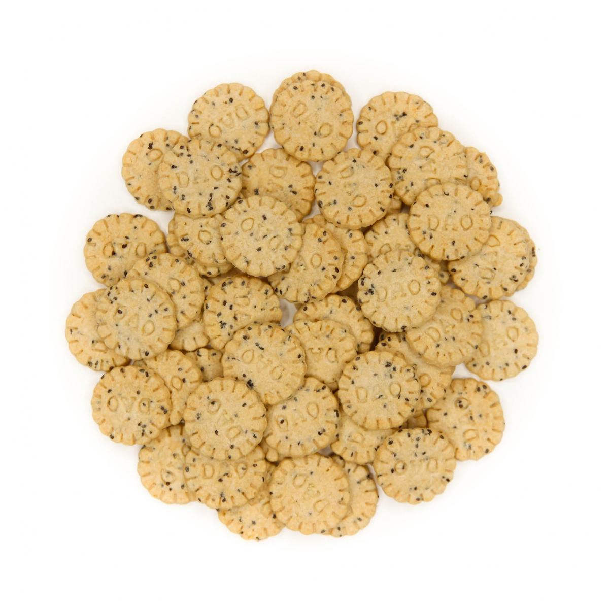 Ingrédients : Farine de blé, huile de coco, Parmesan AOP (9%) Emmental, sucre glace ( sucre de canne blond, fécule de pomme de terre) gomme d'acacia, graine de chia ( 3,5%) Oeuf entier en poudre, sel de Guérande , Traces possibles de sésame. Ingrédients issus de l'agriculture biologique.