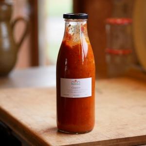 Ingrédients : tomate*, concombre*, poivron*, huile d'olive, oignon*, vinaigre, ail*, sel.