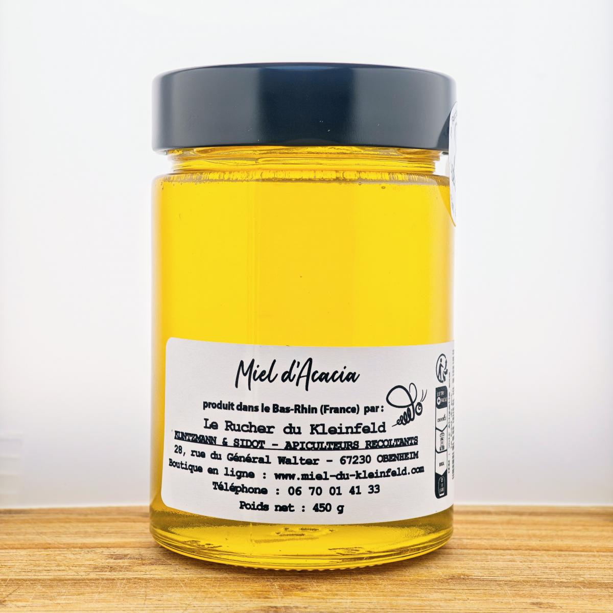 Notre Miel d'Acacia est produit sur les flancs du Kronthal entre Marlenheim et Wasselonne. Sa texture est liquide, son odeur est fleurie avec une intensité et une persistance moyenne. Sa saveur est fleurie avec des notes légèrement vanillées. Note miel d’acacia est suave avec un goût sucré élevé.
