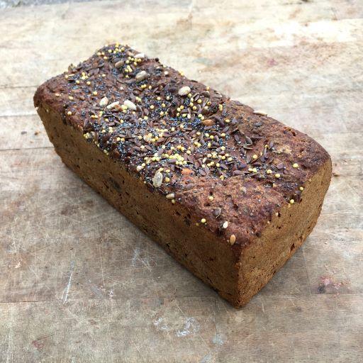 farine de riz, de pois chiche et de sarrasin, fécule de pomme de terre et de maïs torréfié, huile, sel, sucre, levain de riz et de petit épeautre, graines de tournesol, courge et pavot, gomme de guar, psyllium