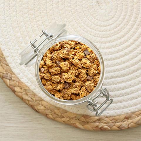 Flocons d'avoine complets* 42%, sucre de canne complet*, huile de tournesol*, soufflettes au chocolat* 7,8% (riz*, sucre de canne*, poudre de cacao dégraissé*, blé complet*, avoine complète* 0,3%, orge complète*, pépites de chocolat* 0,1% [pâte de cacao*, sucre de canne*, beurre de cacao*, extrait de vanille*], sirop de malt d'orge déshydraté*, poudre de cacao*, vanille*), sirop de riz*, farine de blé*, flocons de blé complets*, flocons de seigle complets*, flocons d'orge complets*, amandes toastées*, pétales de maïs*, morceaux de chocolat noir* 3,4% (masse de cacao*, sucre de canne*, beurr
