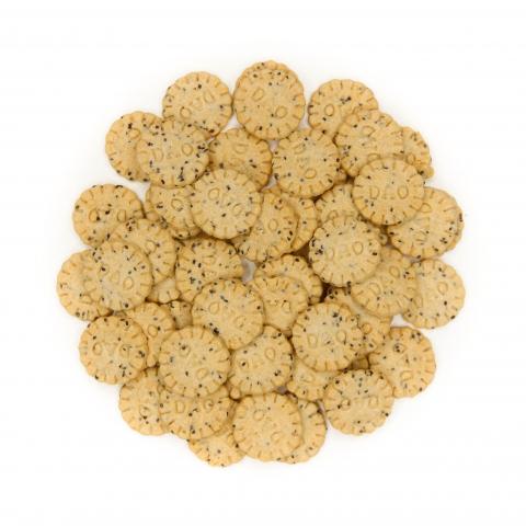 Ingrédients : Farine de blé, huile de coco, Parmesan AOP (9%) Emmental, sucre glace ( sucre de canne blond, fécule de pomme de terre) gomme d'acacia, graine de chia ( 3,5%) Oeuf entier en poudre, sel de Guérande , Traces possibles de sésame. Ingrédients issus de l'agriculture biologique.